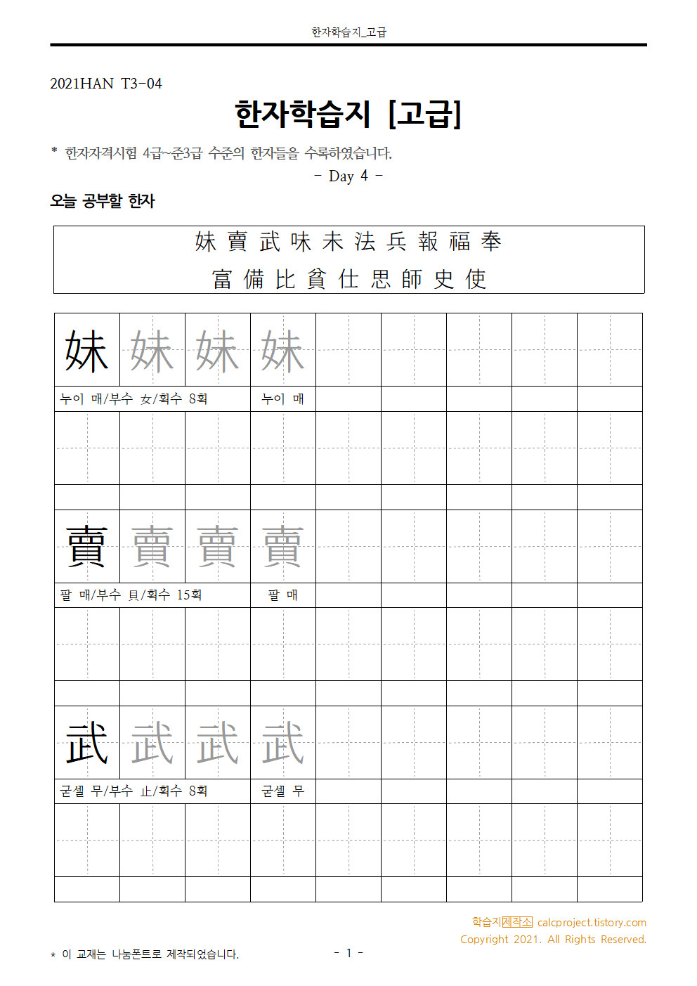 한자학습지는 2020년 말부터 연재하기 시작한 컨텐츠로, 한자자격시험을 준비하는 아이들부터 교양을 쌓고 싶은 분들이라면 부담없이 공부할 수 있는 자료입니다. 일주일에 한 편 꾸준히 연재하고 있으니, 많은 관심 가져주시면 감사하겠습니다.