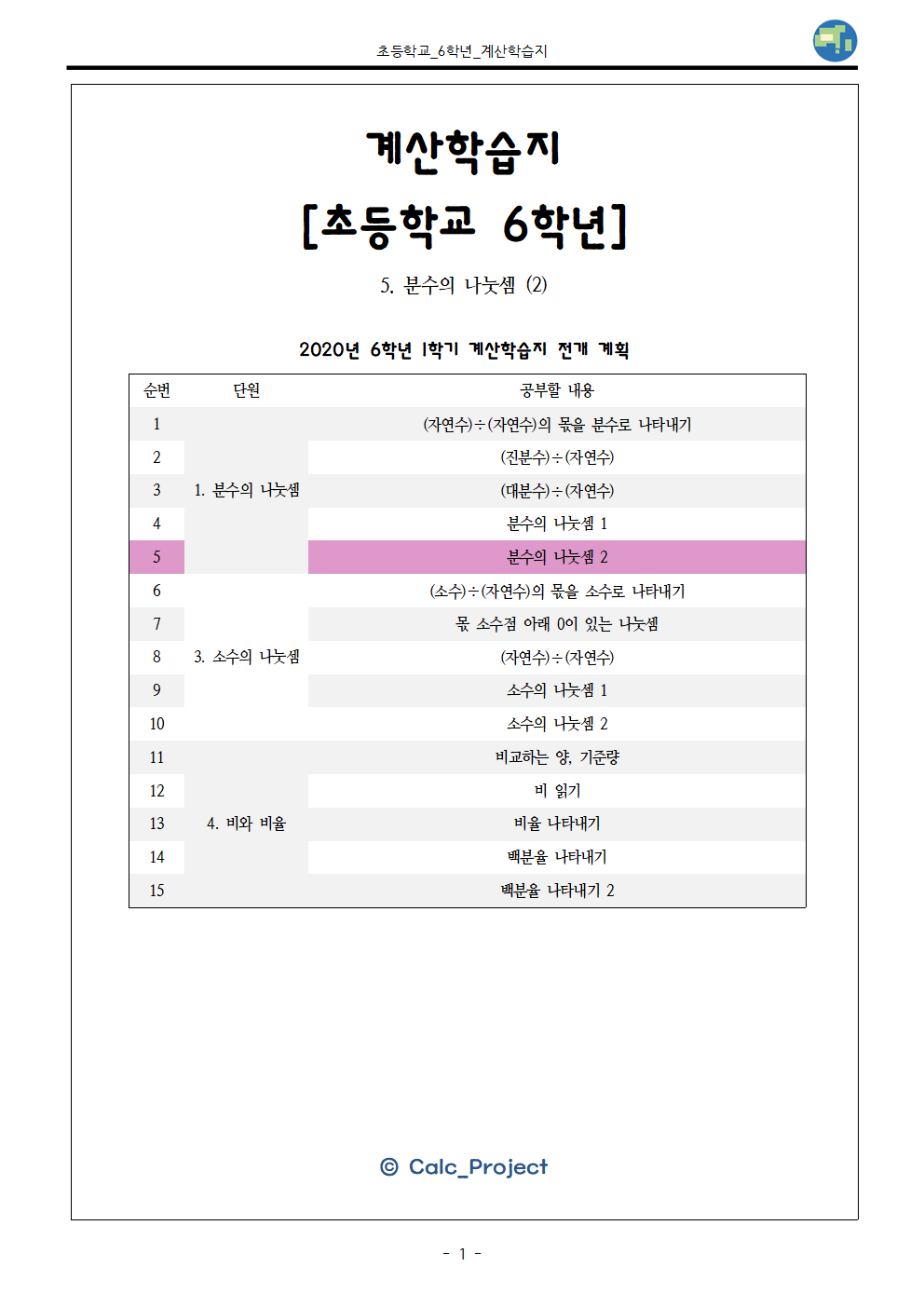 이번 포스팅으로 1단원 분수의 나눗셈을 마무리하니, 지난 학습지를 다시 풀어보며
