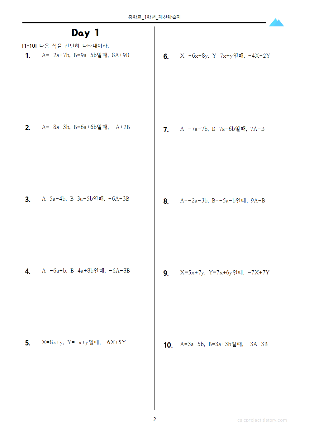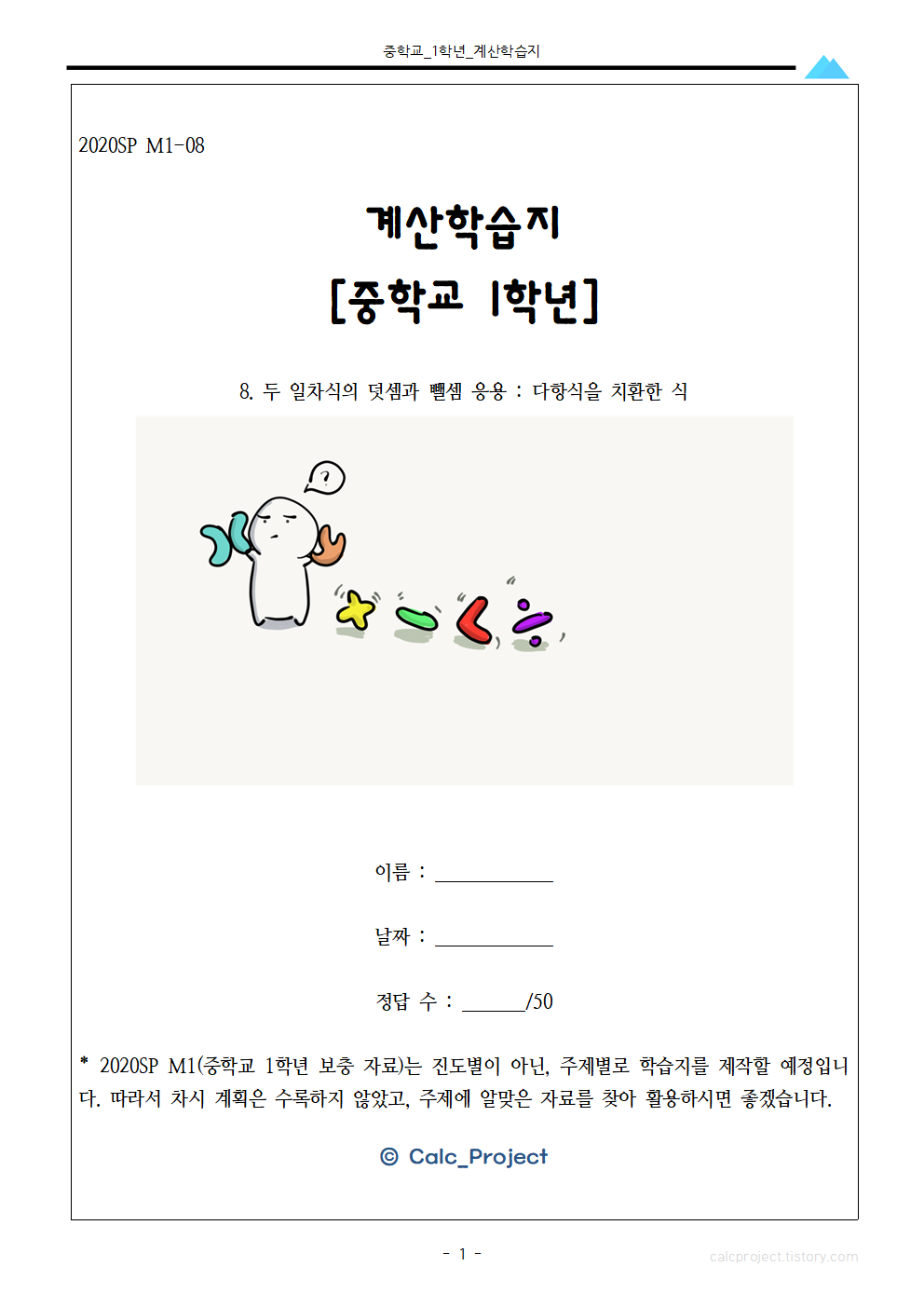 지난 7번 학습지에서는 문자와 식 단원의 일차식의 연산 문제를 다루었는데요,