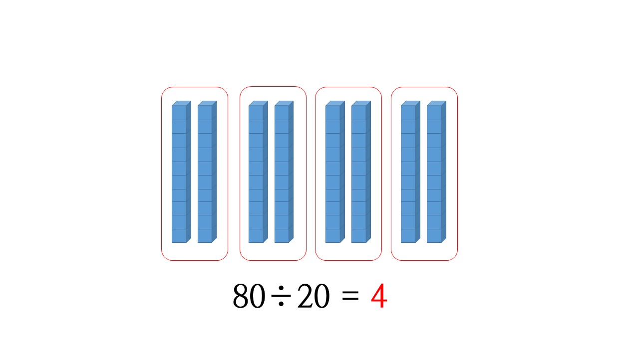 따라서 십모형 8개를 2개씩 똑같이 나누어야 하므로 4묶음이 됩니다. 정리하면 80÷20=4입니다.