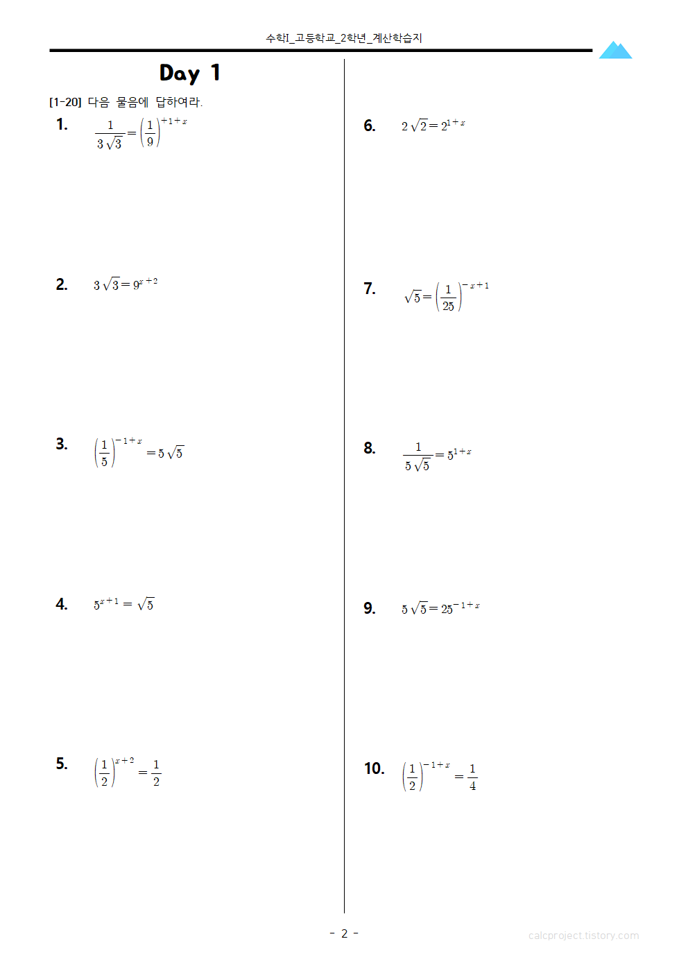 이번 학습지는 지수방정식으로, 밑을 똑같이 맞춘 뒤 지수를 등식으로 만들어 해를 구하는 문제들로 구성했습니다.