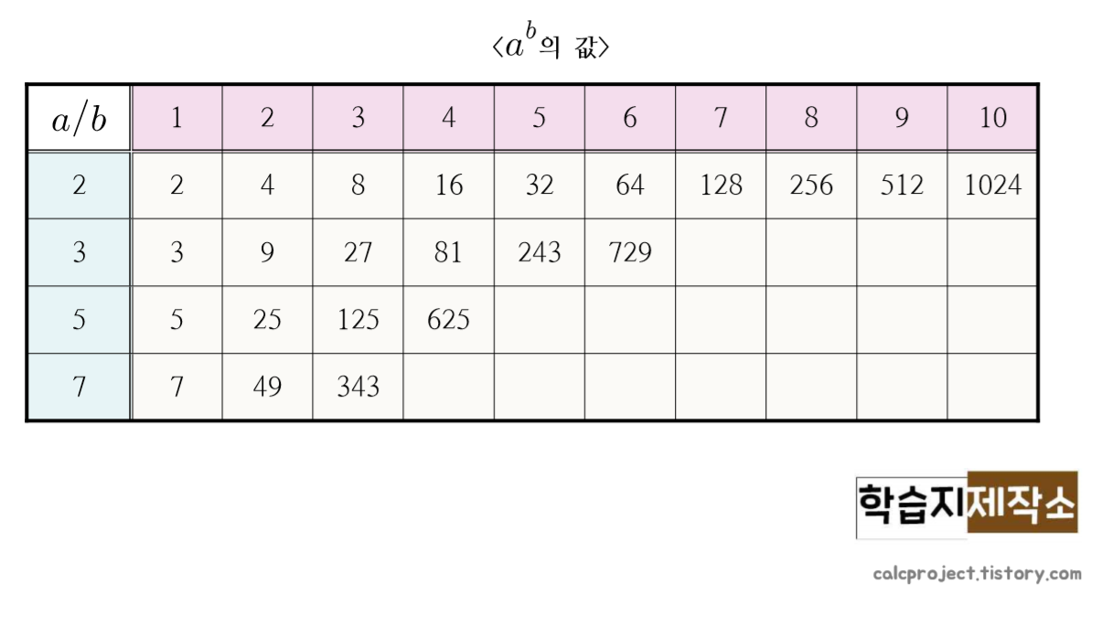 밑이 2,3,5,7일 때 거듭제곱수는 아래 표와 같습니다. (단, 2의 10제곱은 포함하였습니다.)