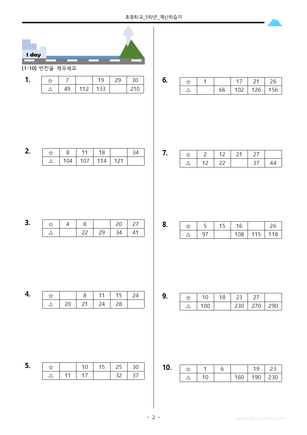 이번 학습지는 두 양(☆, △)의 관계가 차가 같은 관계인지, 나눈 몫이 같은 관계인지 따진 후, 빈칸을 채우는 학습지입니다. 쉬운 문제부터 세 자리 수가 있는 어려운 문제까지 골고루 섞어보았습니다. 이번 학습지를 풀어보면서 아이가 규칙을 이해할 수 있도록 지도해주시면 아이가 규칙성을 이해하는 데 도움이 될 것입니다.