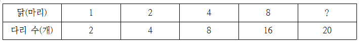 Q. 닭장에 닭들이 있습니다. 닭의 수와 닭의 다리 수를 표로 나타낼 때, 다음과 같이 표를 나타낼 수 있습니다.