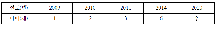 Q. 민수는 2009년에 태어났습니다. 연도에 따른 민수의 나이를 표로 나타낼 때, 다음과 같이 표를 나타낼 수 있습니다.