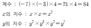 세 다항식이 모두 곱해져 있는 경우, 계수를 각각 곱하고, 지수법칙에 의해 지수를 더합니다.