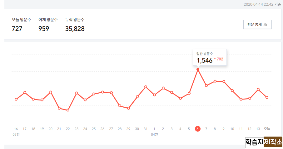 기쁘기도 하고 아쉽기도 합니다. 4월 6일 하루 방문수를 1546명으로 기록했습니다. 물론 이전에 두 번 정도 1000명을 넘긴 적도 있었지만, 1500을 넘긴 적은 4월 6일이 유일합니다. 많은 분들이 제 블로그를 방문해주셨고, 프리미엄 연산문제를 신청하시는 분들도 늘었습니다. 블로그가 점점 살아나는 것 같아 보람찬 날이었습니다.