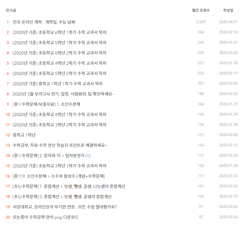 아쉬운 점은 이 조회수의 대부분이 '전국 온라인 개학일'을 주제로 쓴 교육 이슈 글이라는 점입니다. 다들 아시다시피 이슈성 글은 글의 수명이 굉장히 짧습니다. 하지만 많은 사람들이 그 짧은 시간동안 방문합니다. 1위 글이 2위 글의 8배 정도 되니, 개학일과 관련해 방문하신 분들이 많음을 알 수 있었습니다.