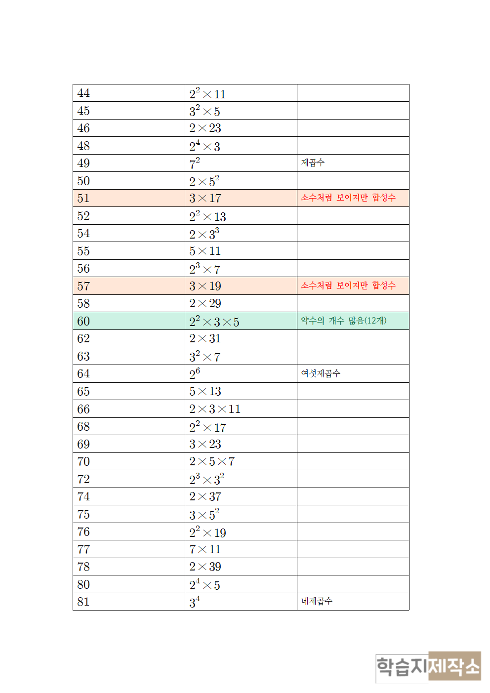 60은 약수가 많아 자주 출제되는 자연수고, 51,57,87,91은 소수로 착각할 수 있는 합성수라 표기를 해놓았습니다.
