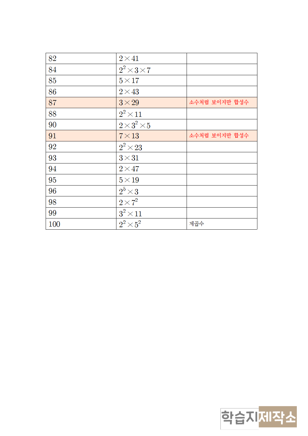 태그 : 학습지제작소, 중1 수학, 중학교 1학년 수학, 소인수분해 문제, 소인수분해 하는 법, 1부터 100까지 소인수분해, 소인수분해 표, 소인수, 인수, 소인수분해 개념, 학습지, 다운, 무료, 다운로드