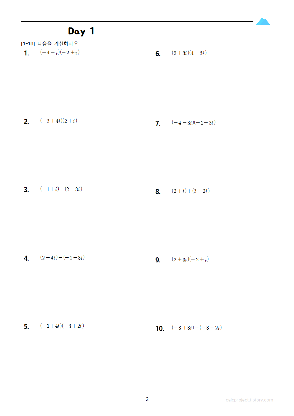 #태그 : 고등수학(상), 고1 수학, 고등학교 1학년 수학, 복소수와 이차방정식, 복소수의 덧셈, 복소수의 뺄셈, 복소수의 곱셈, 복소수 연산 문제, 수학 i, 수학 i 계산, 다운, 다운로드, 학습지 무료, 학습지제작소