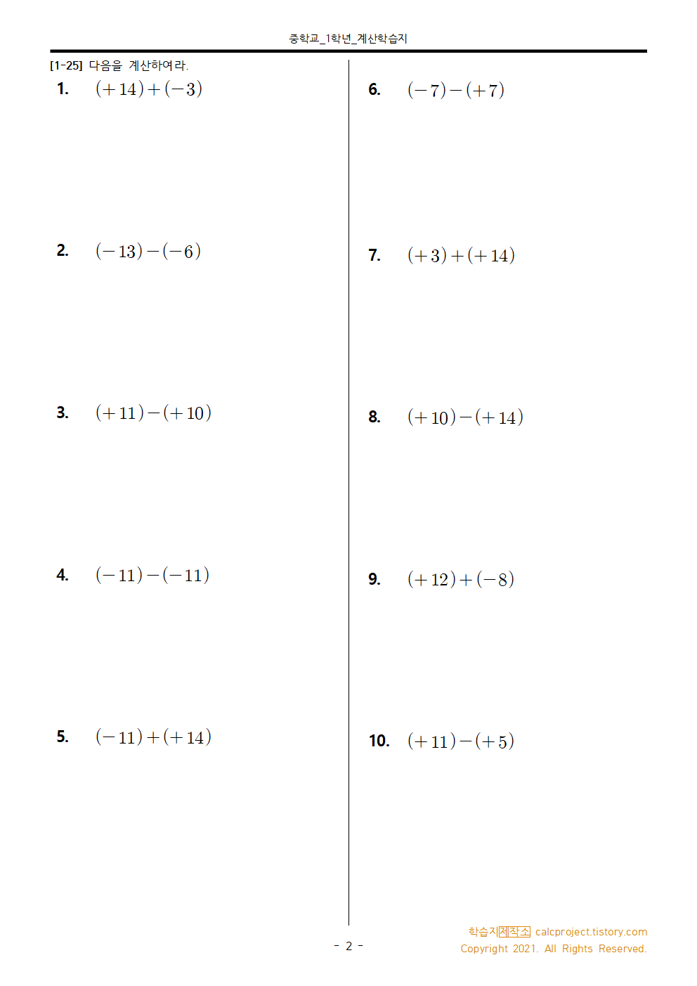 - 6번 학습지부터는 유리수의 계산 단원을 다룹니다. 이번 학습지는 '정수의 덧셈과 뺄셈'을 주제로 했습니다.