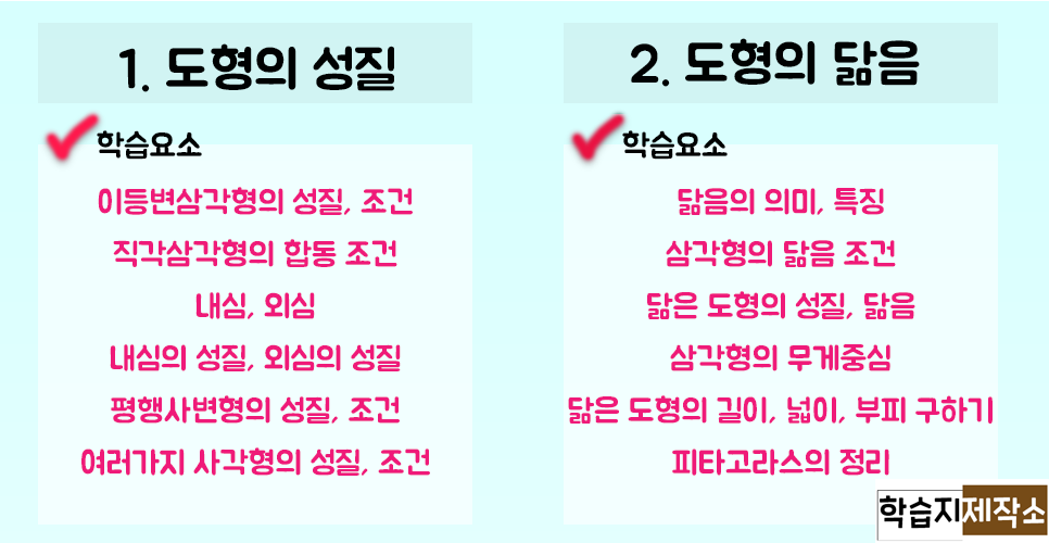 #태그 : 중학교 2학년 2학기, 중2, 중2 수학, 2-2 수학 목차, 닮음, 확률, 합동조건, 닮음조건, 피타고라스 정리, 학습지제작소