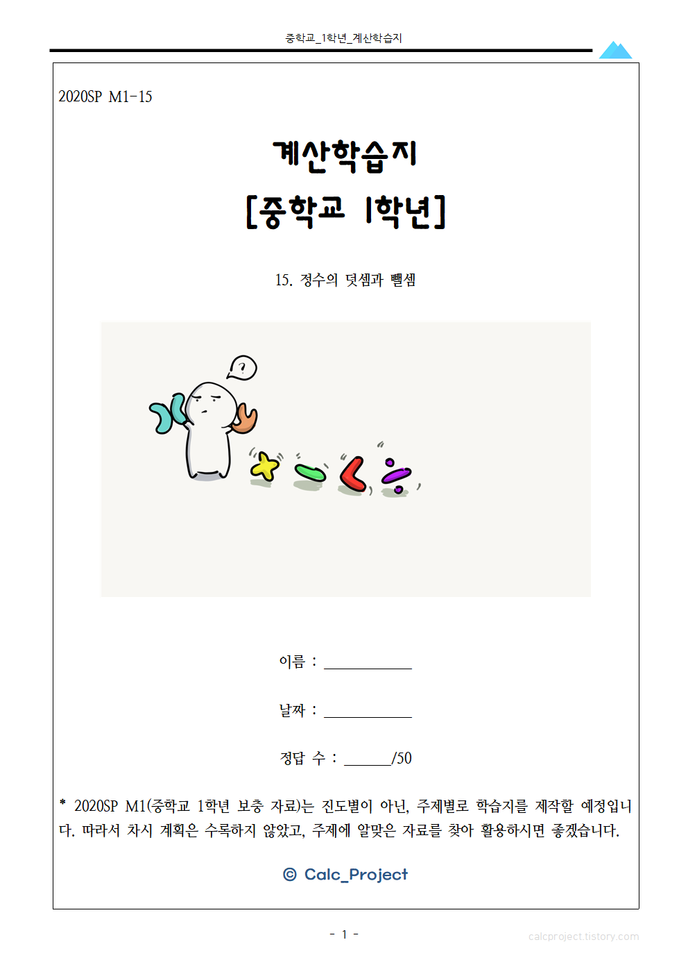 #태그 : 정수의 덧셈과 뺄셈, 정수, 정수 계산, 정수 학습지, 정수 연습문제, 중1, 중학교 1학년 수학, 중학교 수학 학습지, 무료, 다운, 학습지제작소, pdf