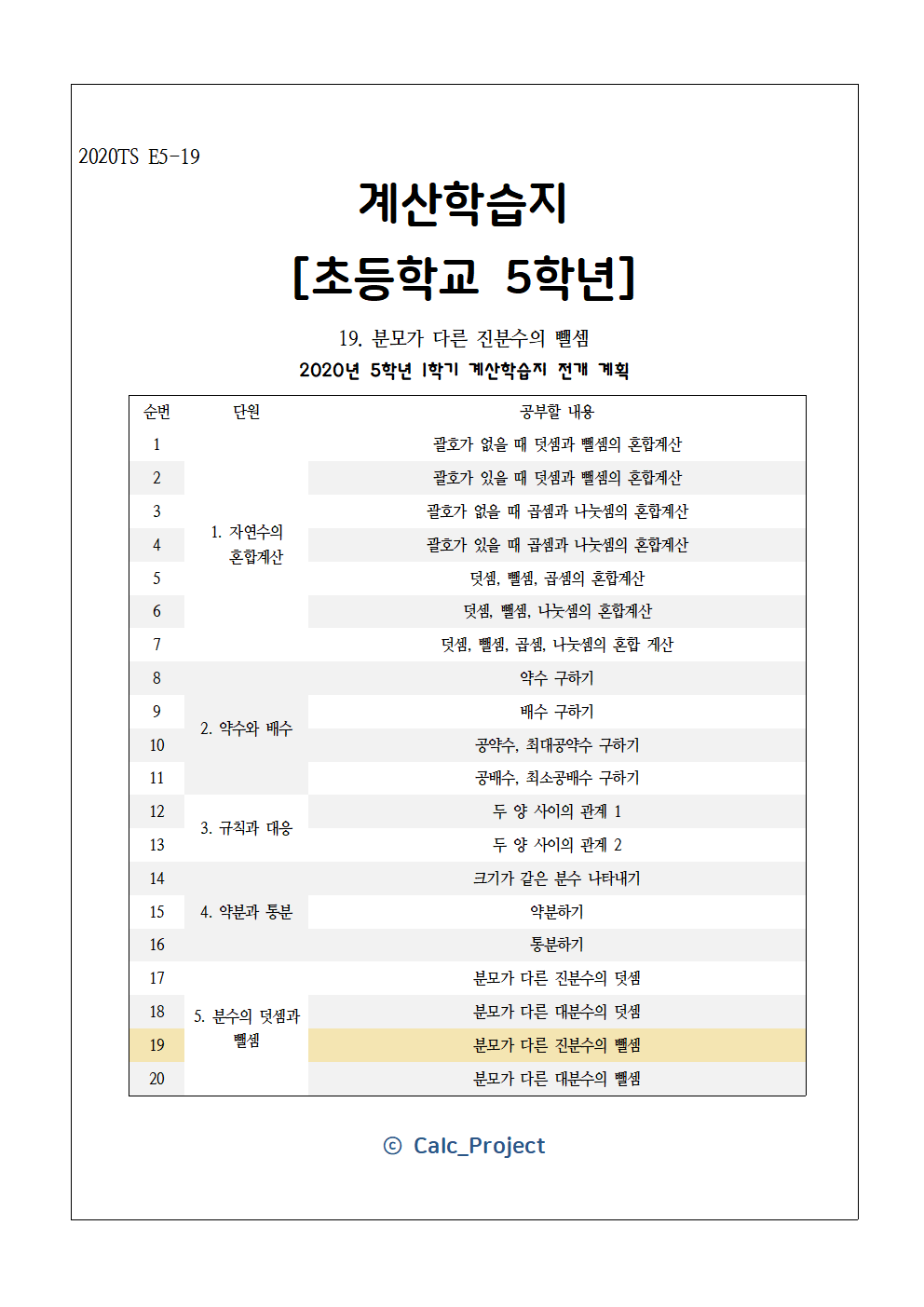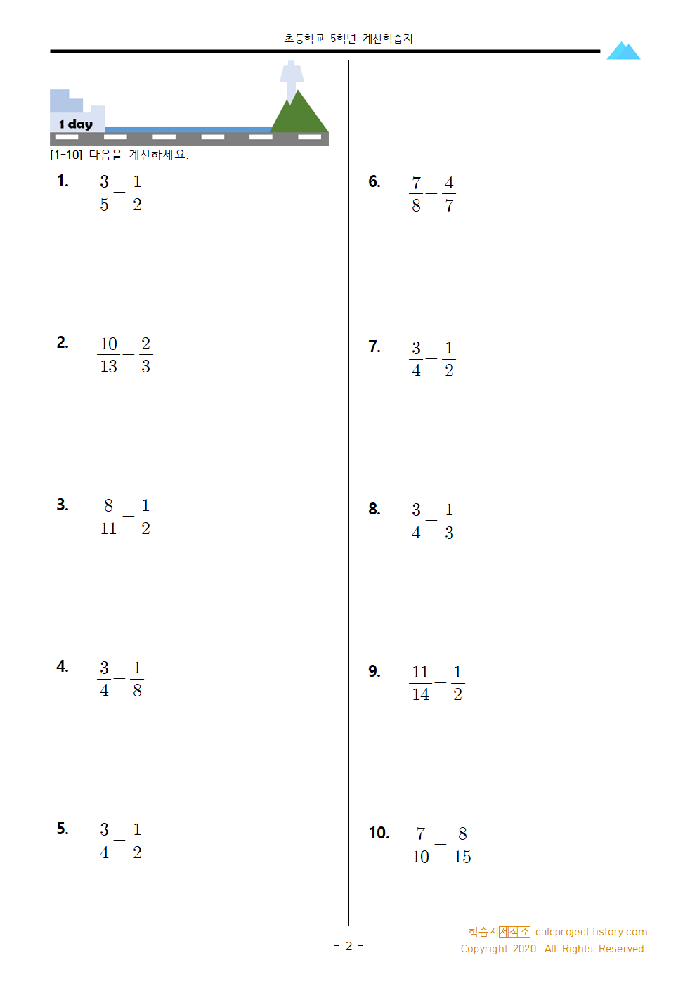#태그 : 분수의 덧셈과 뺄셈, 초5, 초등학교 5학년, 통분, 분수 뺄셈 문제, 이분모분수, 분모가 서로 다른 뺄셈, 연습문제, pdf, 다운, 다운로드, 학습지제작소, 분수 뺄셈 학습지