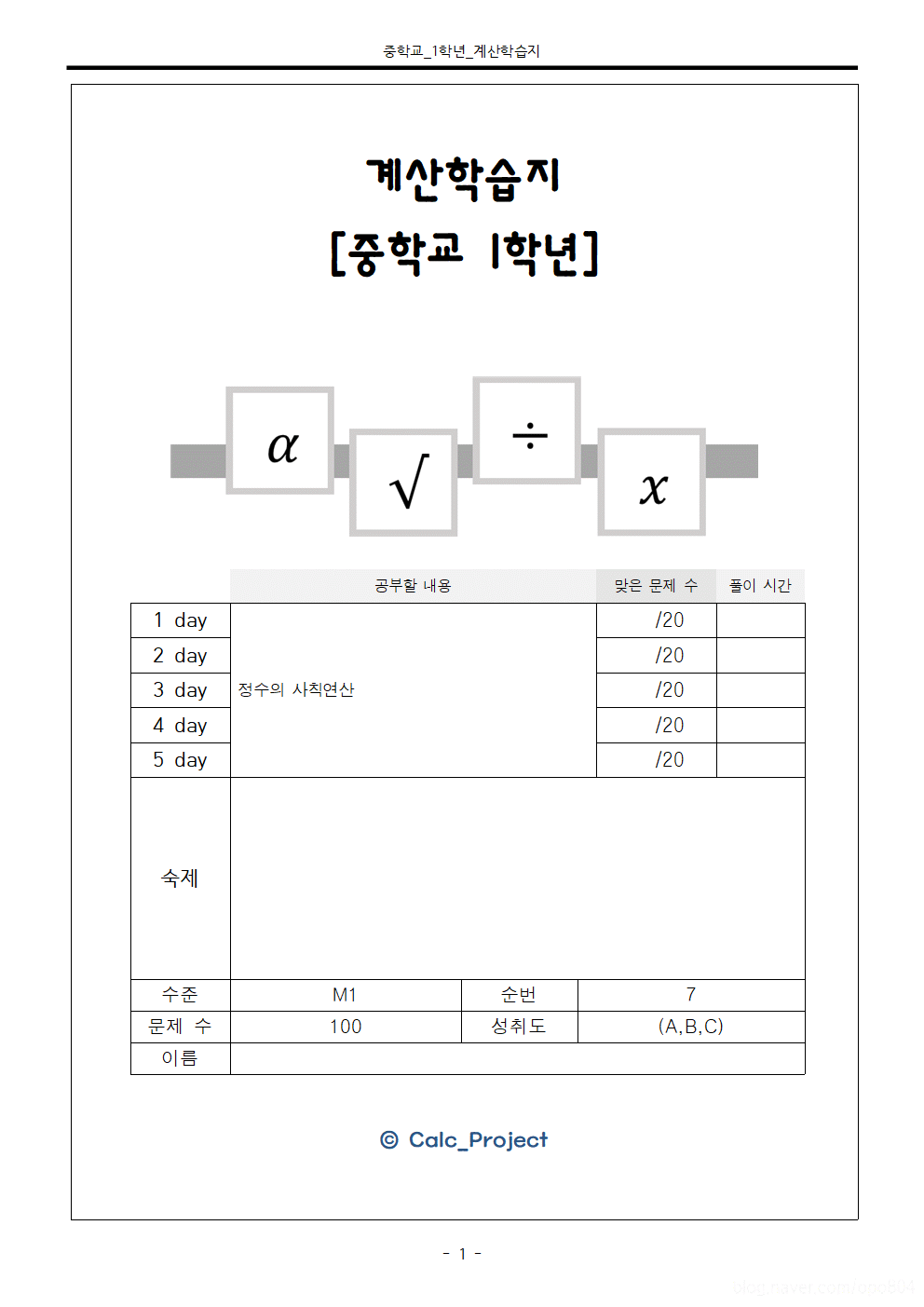 [2019TS M1] 중학교 1학년 연산 연습 학습지입니다.