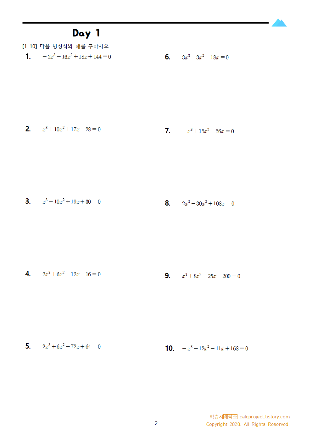 #태그 : 삼차방정식, 여러 가지 방정식과 부등식, 방정식과 부등식, 고등수학(상), 고1, 조립제법, 삼차방정식 연습문제, 삼차방정식 학습지, 삼차방정식 문제, 다운, 다운로드, pdf, 학습지제작소