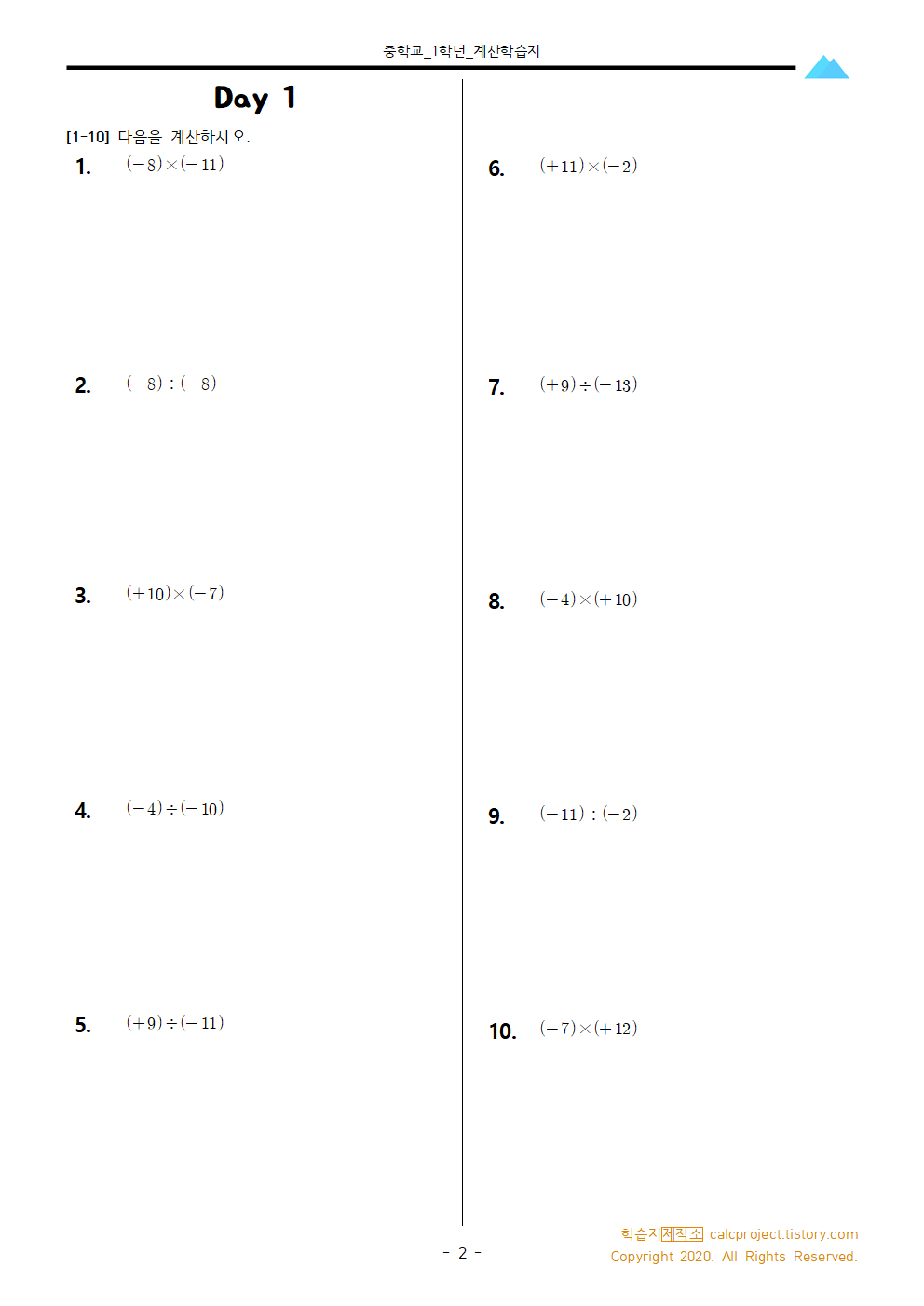 학습지는 두 정수의 곱셈과 두 정수의 나눗셈으로 수록하였고, 나눗셈의 경우 몫이 정수가 아닌 나눗셈도 포함하였습니다. 부호를 보고 몫을 어떻게 나타내어야할지 고민하면서 문제를 풀어보시면 될 것 같습니다.