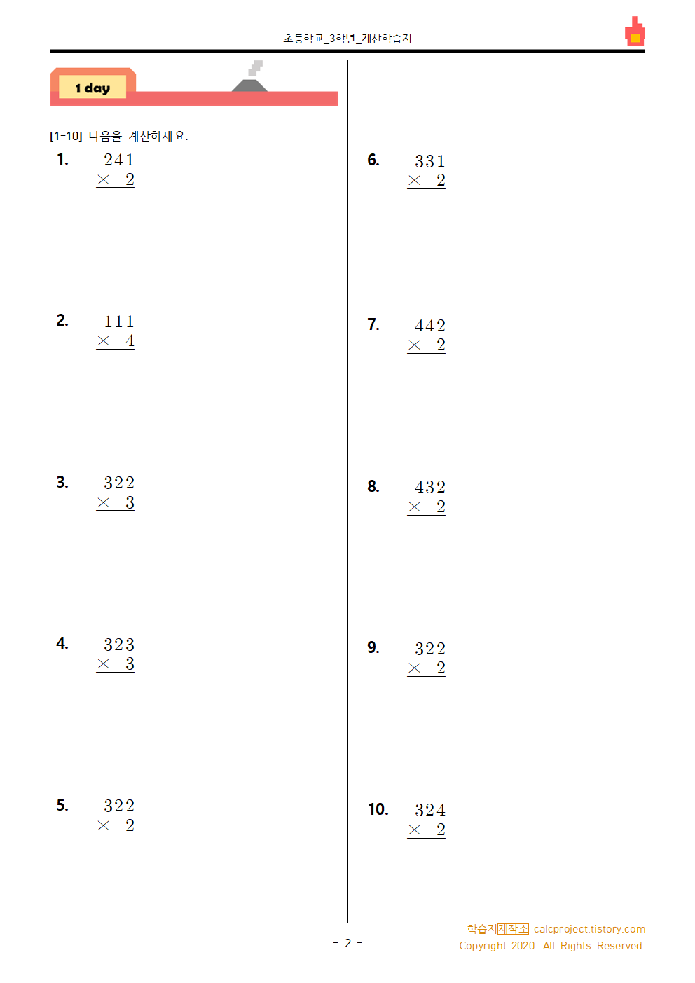 #태그 : 곱셈, 3학년 2학기, 초등학교 3학년, 세 자리 수, 한 자리 수, 곱셈, 학습지, 무료, 다운, 다운로드, 학습지제작소