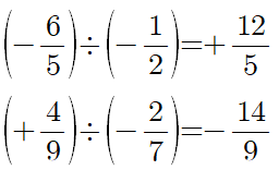 - 두 부호가 서로 같은 경우 : 양의 부호를 붙이고, 나누는 수를 역수로 바꾸어 유리수의 곱셈으로 나타낸 뒤 절댓값의 곱을 구합니다.