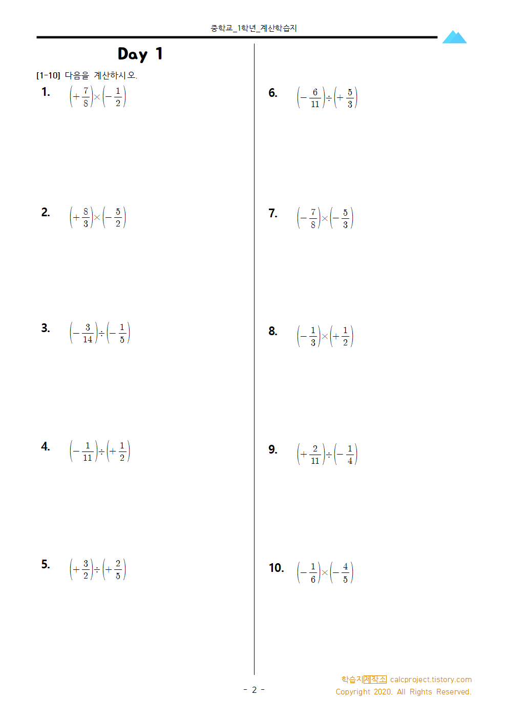 #태그 : 유리수의 곱셈과 나눗셈, 유리수, 곱셈, 나눗셈, 중1, 중학교 1학년, 학습지, 연습문제, pdf, 다운, 다운로드