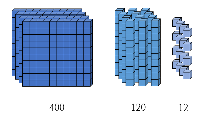 곱은 백 모형 4개, 십 모형 12개, 일 모형 16개입니다.