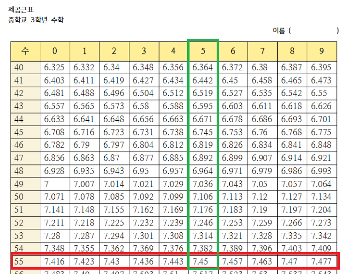 55.5의 양의 제곱근은 왼쪽의 수가 55, 위쪽의 수가 5인 부분이 만나는 값(7.45)를 찾으면 됩니다.