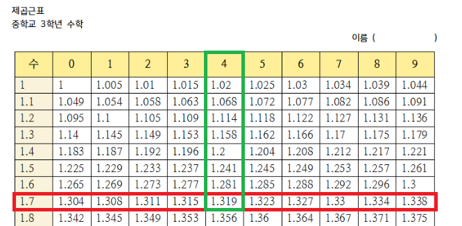 1.74의 양의 제곱근을 구하기 위해서는 왼쪽의 수가 1.7, 위쪽의 수가 4인 부분이 만나는 값(1.319)를 찾으면 됩니다.