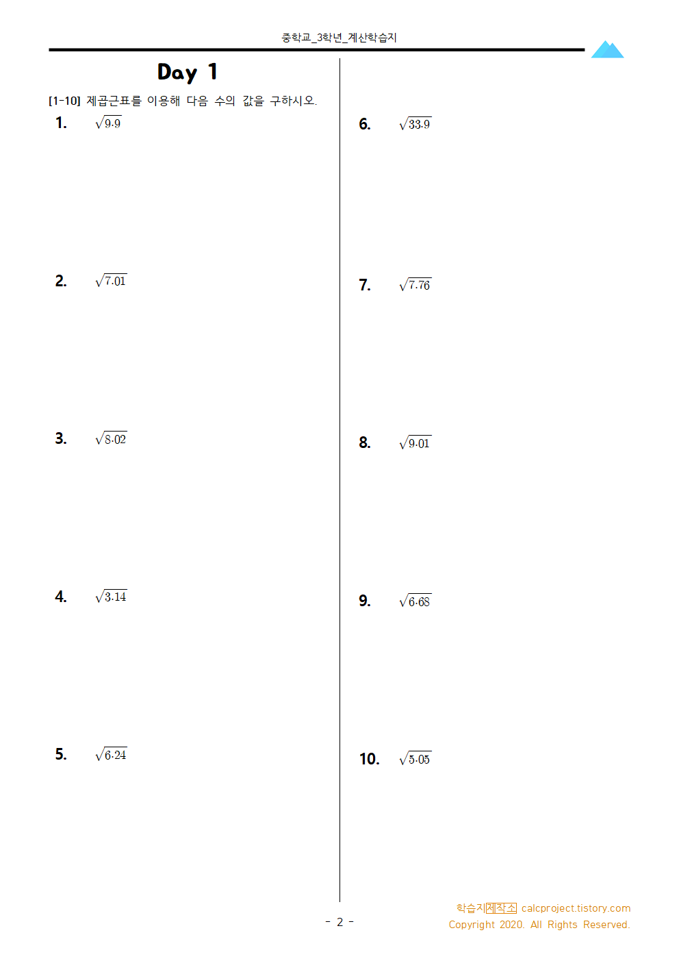 이번 학습지는 제곱근표가 있어야 문제를 풀 수 있습니다. 근호 안의 수를 읽고, 제곱근표에서 알맞은 값을 찾아 적으면 문제를 해결할 수 있습니다.