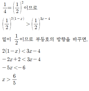 [방법 2] 밑이 1보다 크면 부등호를 그대로 놓고 지수끼리 비교한다. 밑이 1보다 작으면 부등호의 방향을 바꾸고 지수끼리 비교한다.