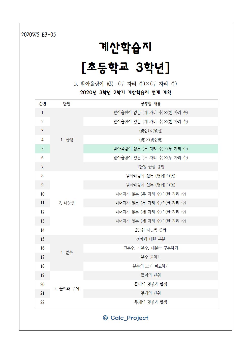 5번 학습지는 곱셈 과정 중 받아올림이 없기 때문에 자릿수에 맞추어 계산하는 데 집중할 수 있도록 만들었습니다.