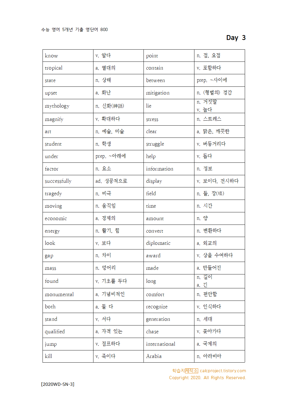 | 수능 5개년[2016~2020학년도] 기출 영단어 800 - Day 1 (영어 단어 + 빈칸문제) (0) | 2020.07.13 |