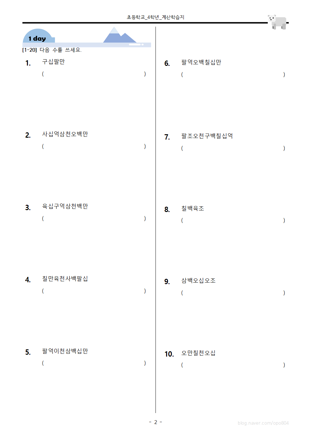 4학년 1단원 '큰 수' 단원에서는 큰 수를 읽고, 쓰며, 뛰어세고 비교하는 활동을 합니다. 이번 학습지는 두 번째 큰 수 쓰기를 위한 내용으로 구성했습니다. 다만, 아이들의 어려움과 귀찮음을 고려하여 일천이백삼십사만오천육백칠십팔과 같은 음절이 많은 수보다는 일천이백삼십만과 같이 음절이 상대적으로 적은 큰 수를 위주로 제작했습니다.