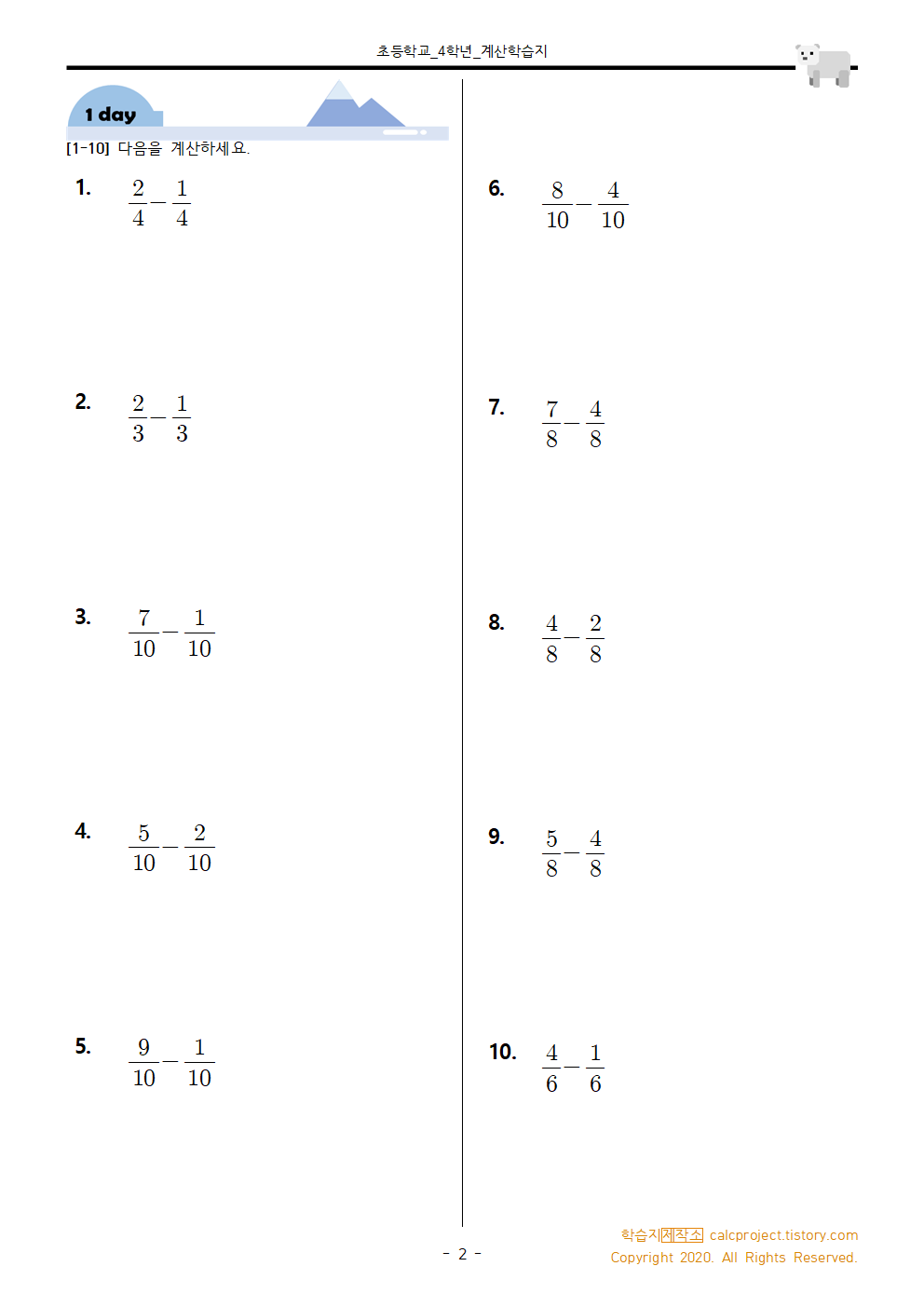 #태그 : 진분수, 분수, 분수의 뺄셈, 초4, 초등학교 4학년, 분수의 뺄셈 문제, 진분수-진분수, 연습문제, 학습지, 공유, 다운, 다운로드, pdf, 학습지제작소