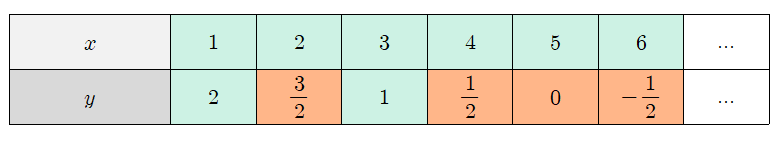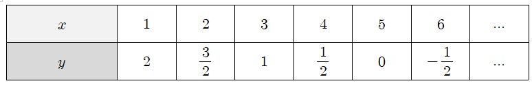 x와 y가 자연수일 때,미지수가 2개인 일차방정식은 x=1부터 차례대로 대입해서 구해볼 수 있습니다.x=1부터 1씩 늘려가며 대입했을 때 x,y의 값은다음과 같습니다.