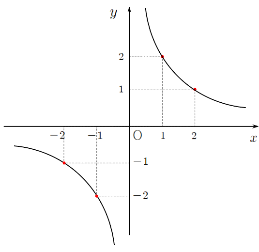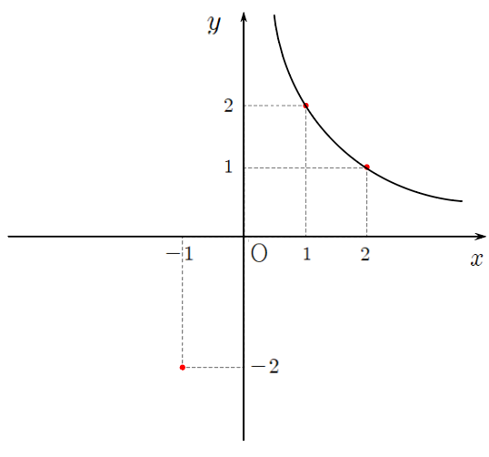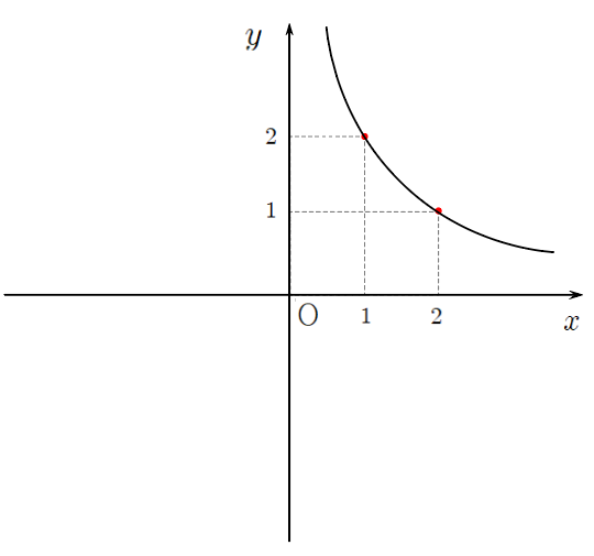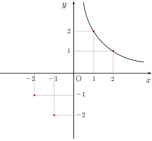 3. 두 점을 지나며 x축과 y축을 점근선(점점 가까워지는 직선)으로 갖는 곡선을 그린다.