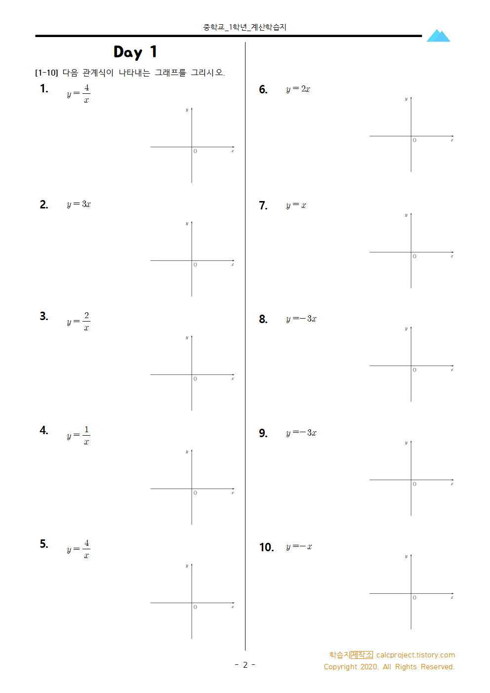 #태그 : 좌표평면과 그래프, 정비례 그래프, 반비례 그래프, 정비례 그래프 그리는 법, 반비례 그래프 그리는 법, 중1, 중학교 1학년, 학습지제작소, 그래프 학습지