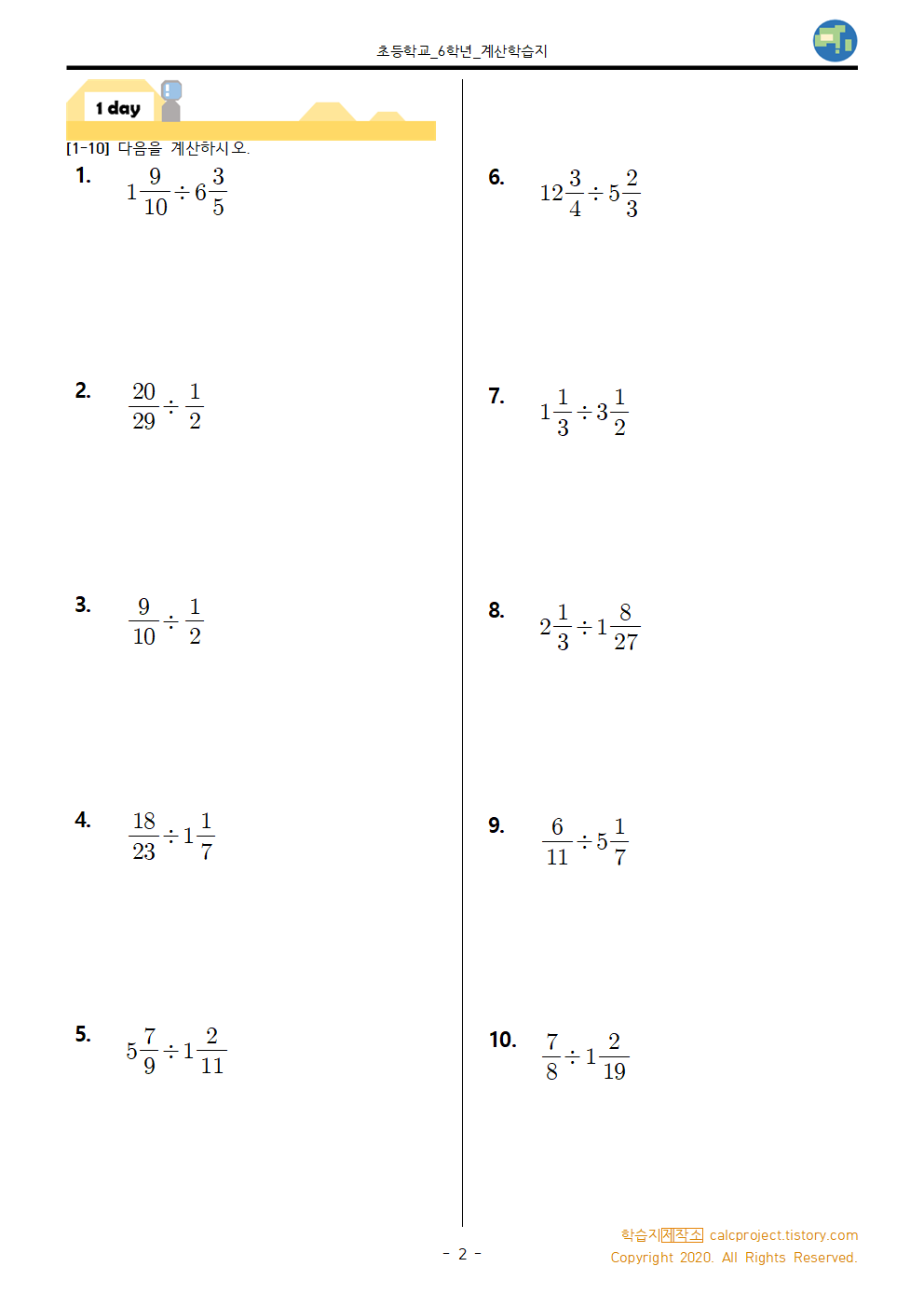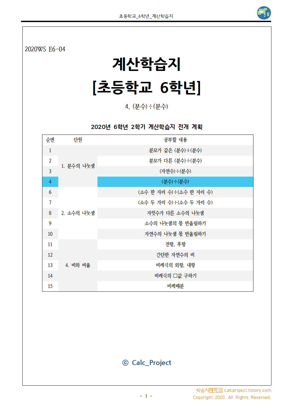 #태그 : 분수의 나눗셈, 분수 나누기 분수, 분수/분수, 분수의 나눗셈 계산하는 방법, 분수의 나눗셈 실생활, 초6, 초등학교 6학년, 연습문제, 다운, 다운로드, pdf, 학습지제작소