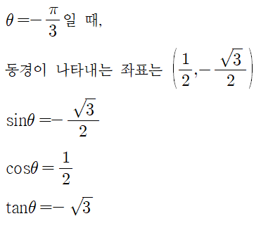삼각함수는 동경의 크기에 따라 변화하는 함수입니다.