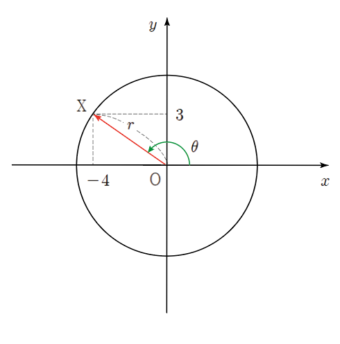 예) 점 X(-4,3)을 지나는 동경에 대하여 각의 크기를 θ라 할 때,