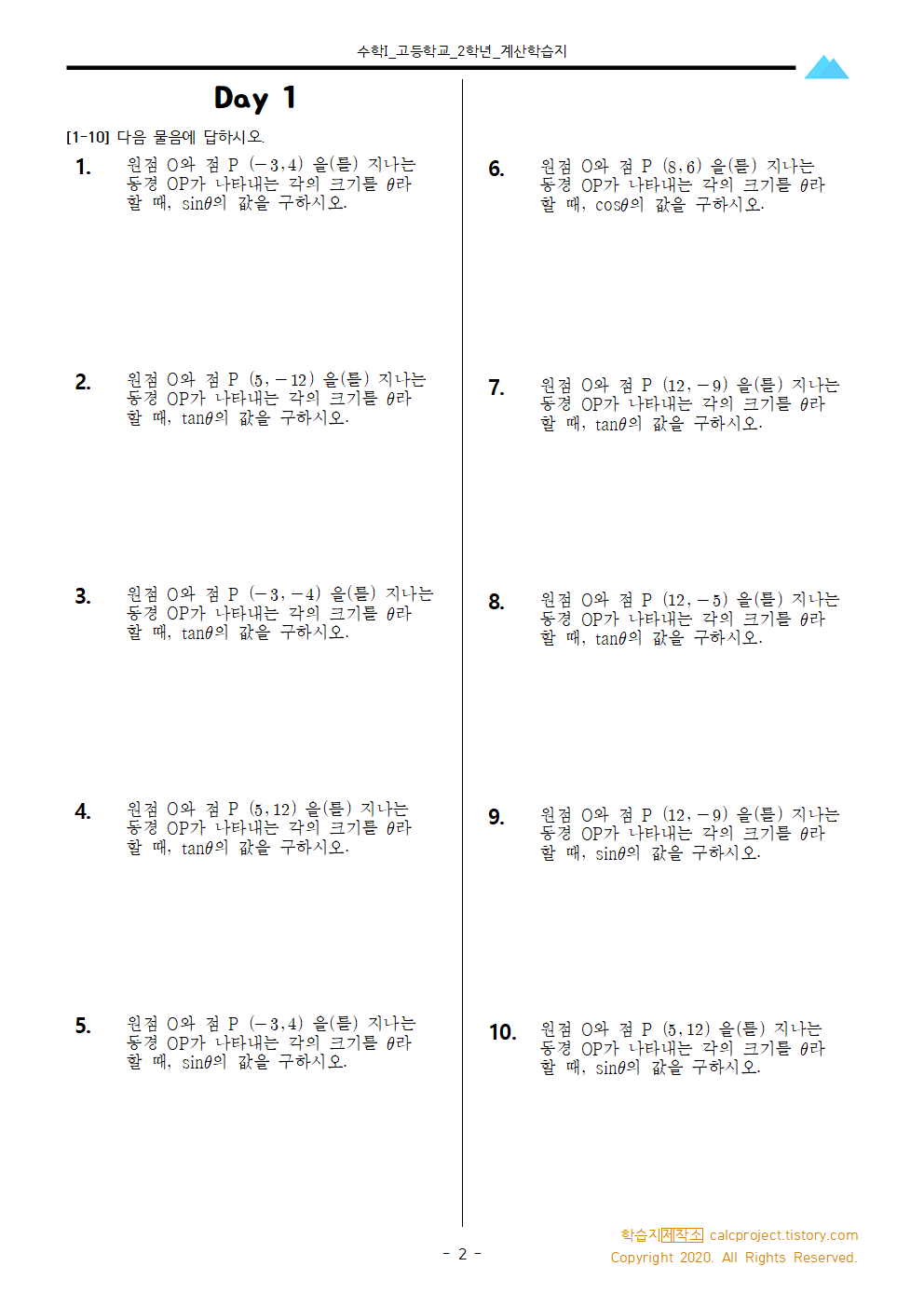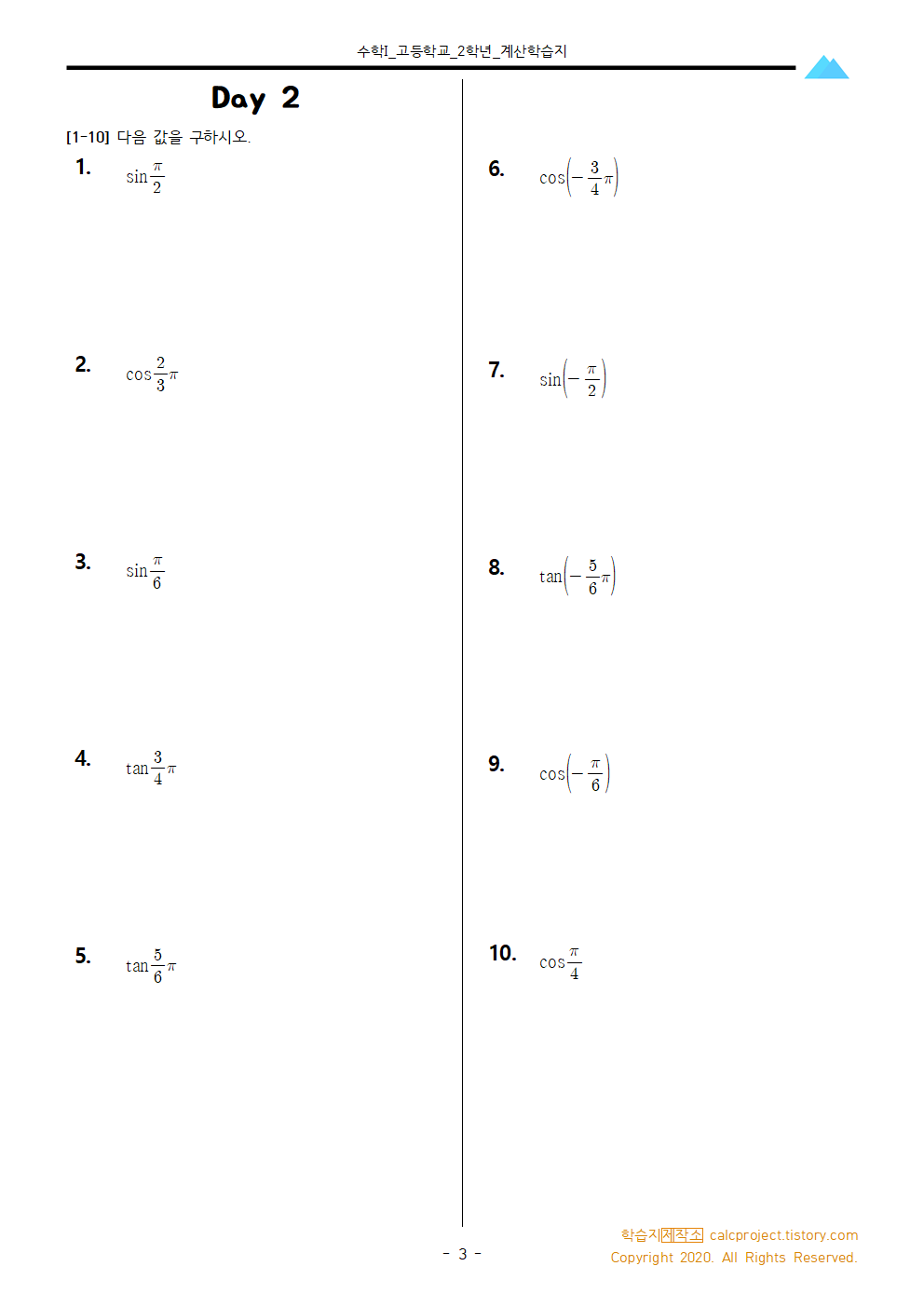 호도법으로 주어진 삼각함수의 값을 구하는 문제로 각각 10문제씩 구성했습니다.