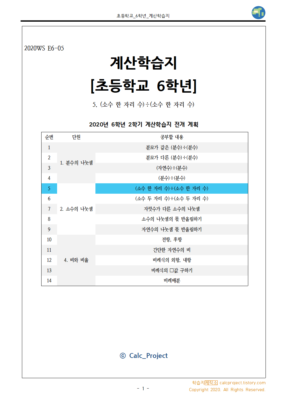 #태그 : 소수의 나눗셈, 소수 나누기 소수, 소수 한 자리 수 나누기 소수 한 자리 수, 초6, 초등학교 6학년, 소수 소수 나눗셈 문제, 연습문제, 다운, 다운로드, 무료, pdf, 학습지제작소
