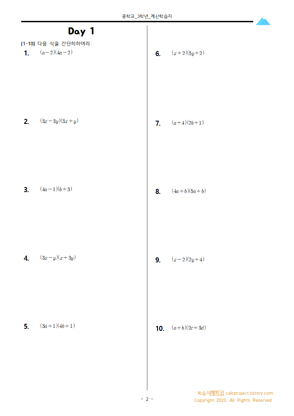 이번 학습지는 다항식의 곱셈으로, 항을 차례대로 곱해준 다음 동류항을 더해 간단히 나타낼 수 있습니다. 문제를 풀어보면서 연습해보시길 바랍니다.