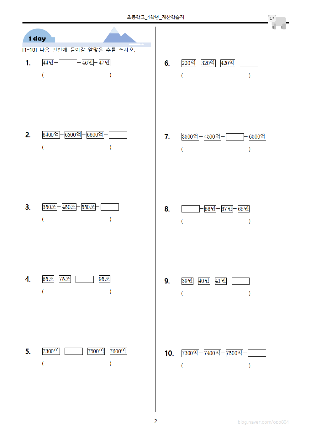 이번 학습지는 큰 수를 뛰어세어봄으로써 수의 계열을 이해하고, 후속학습인 큰 수 비교하기 활동에서 도움이 되고자 구성하였습니다. 빈칸(네모 박스)에 들어갈 알맞은 수를 뛰어세기의 방법으로 구하는 방식입니다.