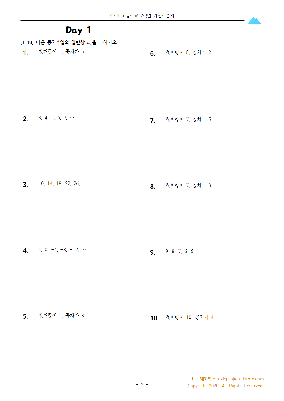 #태그 : 수학I, 수1, 수학1, 고2, 고등학교 2학년, 수열, 등차수열, 등차수열의 의미, 등차수열의 일반항, 공차의 뜻, 공차 구하는 법, 연습문제, 다운 , 다운로드, pdf, 학습지제작소
