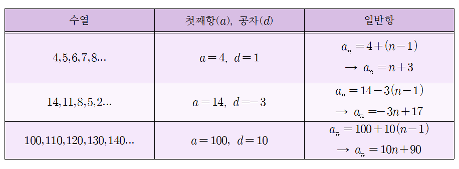 여러 가지 등차수열의 일반항을 구해보면 다음과 같습니다.