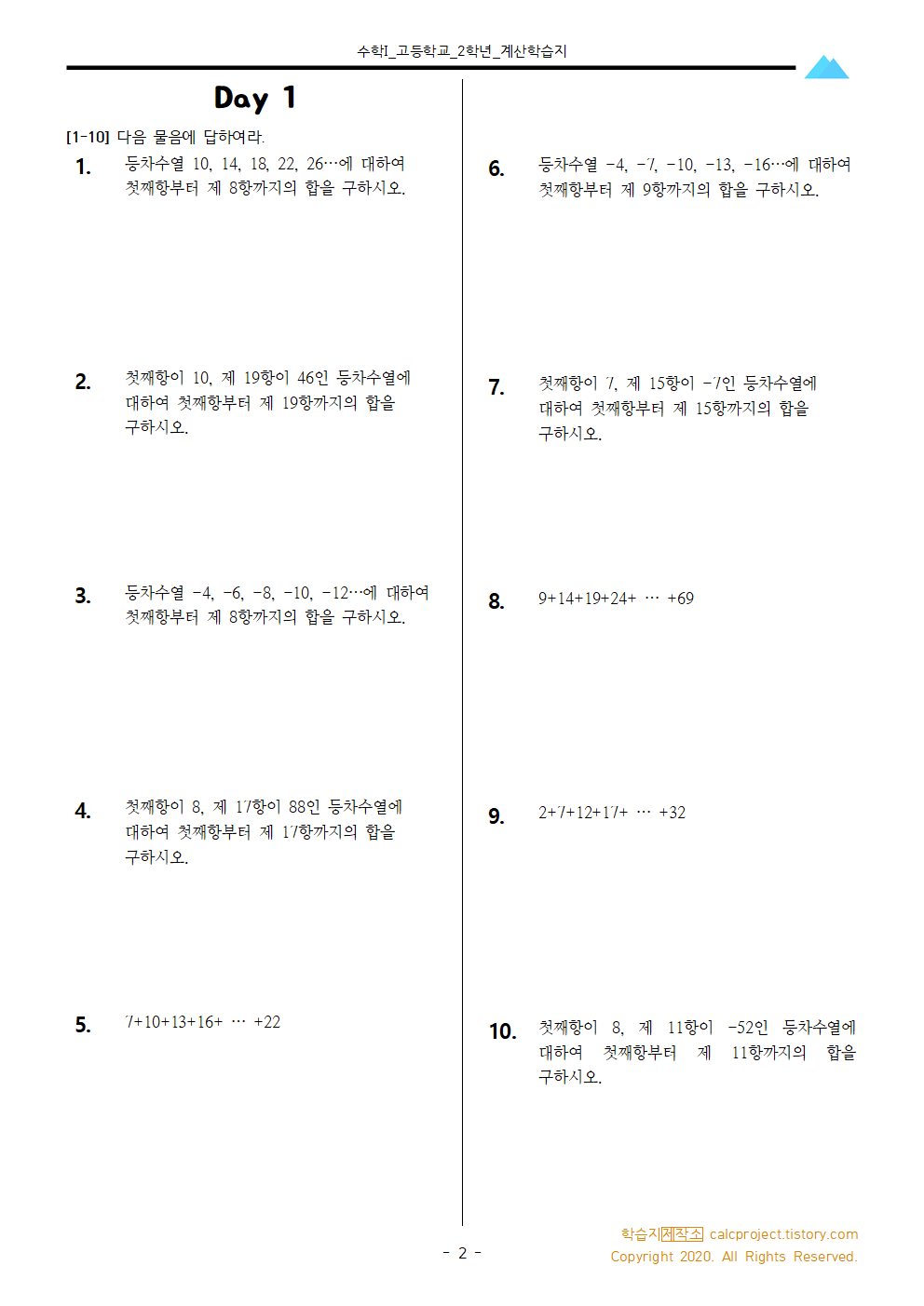 #태그 : 수학I, 수1, 등차수열의 합 공식, 등차수열의 합 구하는 법, 등차수열의 합 수학문제, 연습문제, 무료문제, 다운, 다운로드, pdf, 고2, 고등학교 2학년, 학습지제작소