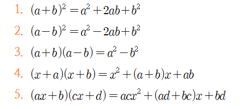 이 중 1~4번은 자연수의 곱셈에 대입하면 계산이 수월해지는 공식들입니다.