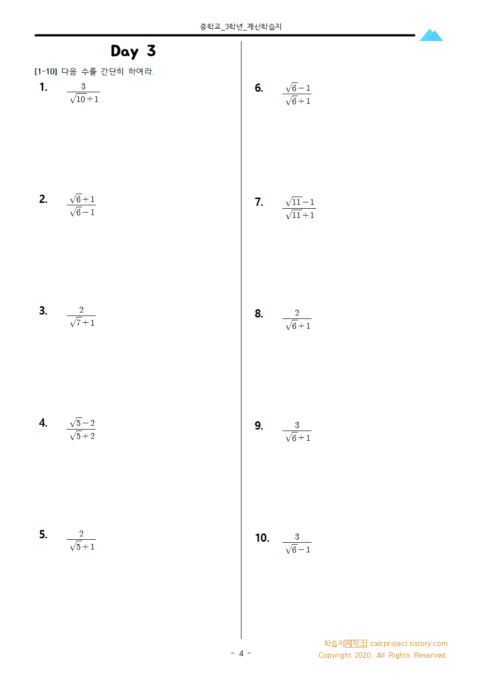 이번 학습지는 곱셈공식을 통한 수의 계산 (20문제)과 곱셈공식을 통한 분모의 유리화 (20문제)를 모두 풀 수 있도록 4day 40문제로 구성했습니다.