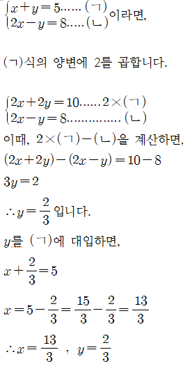 1. 가감법 : 두 식에 적절한 수를 곱하거나 나누어 한 문자를 소거하는 방법